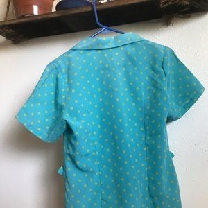 Adorable quirky button up. Great shape besides the last worn down button (which is still functioning but could be replaced!). No size listed but it fits like a small/medium