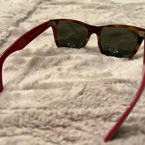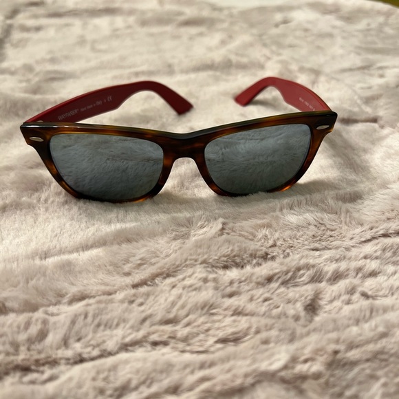 Really unique styled ray-bans, never seen anything similar. Has metallic blue tinted sheen over the glasses so it looks mirrored. Inside of glasses are normal color and appearance. Outside of side pieces is gray and inside is beautiful red. The frame itself has almost cheetah print like appearance. Authentic and gently used.