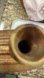 Unique Round Vase Vessel Decanter. Has design on both sides with a patina finish with brass, gold and greens. I believe it is ceramic but has metal sound when tapped. It will stand on the rounded side or turn upside down and stand on the small opening. Says ‘Masterpiece 1991’ on bottom. Very unique. I can see a few runs on one side- see pictures. 12” diameter with 2” top with 1.5” opening.