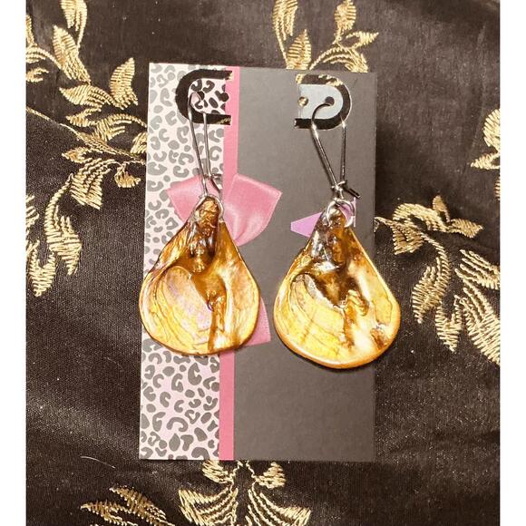 Elevate your accessory game with these stunning glass oyster shell designed earrings. Each earring features a unique teardrop shape and an iridescent orange and brown finish that catches the light beautifully. Perfect for adding a touch of elegance to any outfit. Whether you're dressing up for a special occasion or adding flair to your everyday style, these earrings are a must-have. - Shell design - Iridescent finish - Lightweight and comfortable - Perfect for casual or formal wear. On silver plated hooks. 2 1/4”.