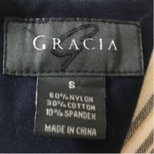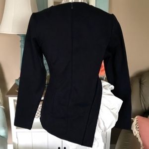Very unique! Size S. Measurements upon request. A thick knit material. Name brand Gracia. In EUC! No flaws that I can find. Zips in the back. Long sleeves. Has a high low hem on one side with ruffles! So adorable- unfortunately too small for me. Needs a new home!Navy and white in color. Hand wash. From a clean and smoke free home! Make an offer!!