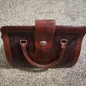 A structured tote-style bag made of rich brown leather with a snakeskin pattern, featuring short top handles and a gold-toned turn-lock closure.