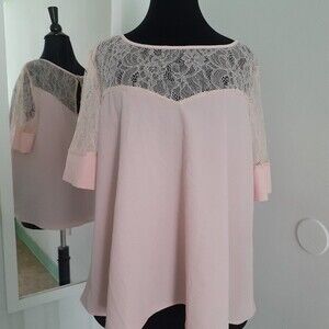 Unique Spectrum Blush Pink Peach Mesh Floral Lace Top Back Keyhole Casual Baby Doll Blouse M