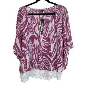 Unique Spectrum Pink & White Printed Lace Hem Dolman Sleeve Blouse Size 1X NWT