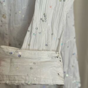 Shine bright in this stunning Unique Spectrum button down blouse, perfect for adding sparkle to any outfit. This blouse is crafted in crisp white fabric and embellished with shimmering sequins that catch the light beautifully. The lightweight polyester material features a crinkle texture, giving it a chic and flattering drape. Designed in a classic button front style with long sleeves, it’s an easy way to elevate both casual and dressy looks.