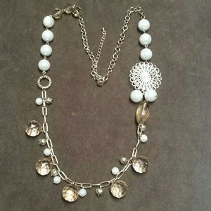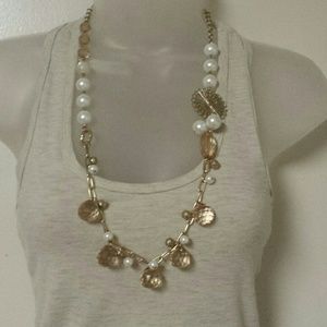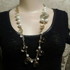 This necklace has a mixture of beads from faux crystal cut prism beads that catch the light to faux small and large pearls with a small golden ring then a giant gold Filagree sun bead.