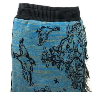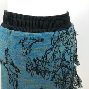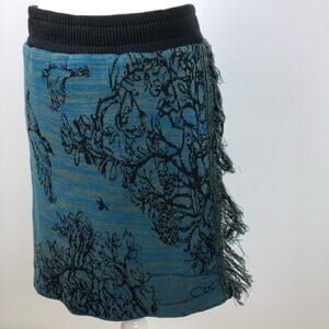 Unique Sweater Girl Novelty Print Fringe Skirt Size Medium with faux wrap, fringe detail, 100% cotton super cozy, beautiful novelty print in black. Color is a teal blue. Like New!!