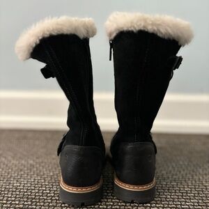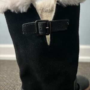 Keep your toddler warm and stylish with these unique winter boots in size 30. Featuring a charming combination of black leather and suede, these boots come with a cozy faux fur lining to keep little feet toasty in the cold weather. The faded look is an intentional part of the boot's unique style, adding a fashionable touch to their winter wardrobe. Equipped with a practical side zipper and decorative buckles, these boots are easy to put on and take off. Barely worn and in great condition, these boots offer both warmth and style, making them a perfect addition to your child's winter gear.
