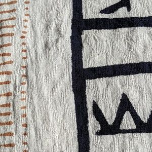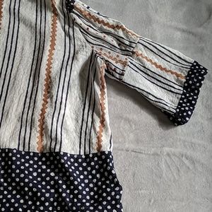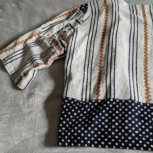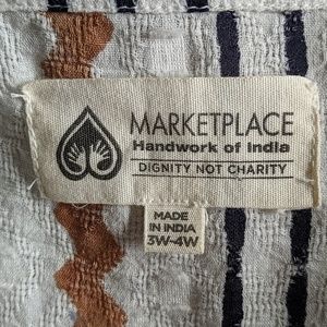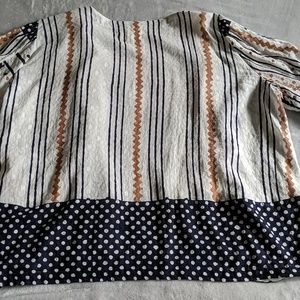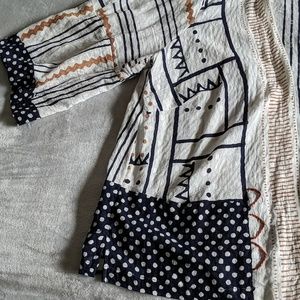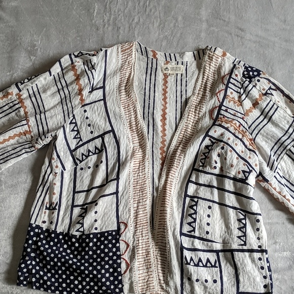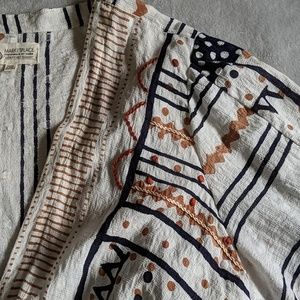 Crafted from artisan fabrics in India with sections of hand embroidery & open front. Redesigned with puffed set-in sleeves & bust darts to give form & structure. Several beautiful cotton fabrics artistically sewn together for an unique garment topper. Wear with your favorite tank dress or tee. Cream background with rust, beige & deep India ink blue. Coordinates well with black.