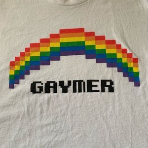 Unique Unisex Rainbow GAYmer T shirt. Vibrant color. No fading. Fair condition. Crew neck. Relaxed fit. True fit: Large to XL build. Has small stain by lower back hem. See last pic.