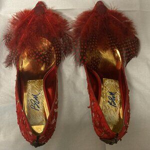 I bought NIB heels second hand that had never been worn. The last photo shows you the before shoe. I dyed, ripped, and painted the surface of the shoe. Inspired by Victorian Gothic, the shoe reminded me of red crushed velvet seen in boudiors. I added the tassle made from a broken necklace. The buttons on the toes are vintage and the red feathers were from a leftover project. Oh, the irony of life, I can’t wear them. I look like a baby giraffe since I’m so flat footed. I love upcycling and collecting, but need to make room in my closets. I see the potential in a lot of things I find second hand. I enjoy remaking and repurposing them. This is the first pair of 3 that I bought to play with and “see what happens.” They are special, unique and one of a kind, not something that should be worn aggressively.