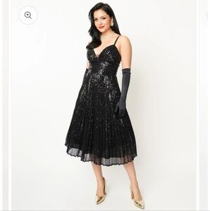 This black 1950s style beauty is adorned with shimmering sequins and features a flattering pleated design that will make you feel like a classic Hollywood starlet. The woven fabric is both luxurious and comfortable, while the adjustable spaghetti straps ensure the perfect fit for any body type. With a charming v-neckline and a convenient back zipper closure, this dress is as practical as it is stylish.