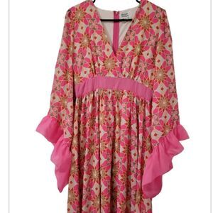 Outfitted with three-quarter length sleeves that dance with ruffled chiffon-style fabric while a back zipper nips in the empire waist.