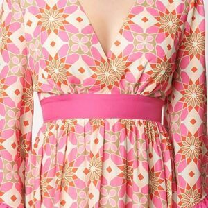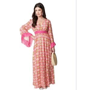 A charming maxi silhouette crafted in a smooth and lightweight woven fabric that dances with a stained glass floral pattern in shades of pink, cream, and orange.