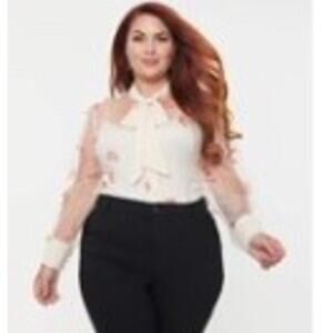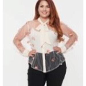 This divine plus size blouse is crafted in a creamy ivory sheer mesh with threaded lines and dainty orange fabric butterflies flying throughout. Complete with a button up front, attached neck tie, and button cuffs.