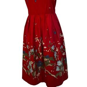 Charming vintage vibrant red floral print midi dress with a classic, feminine silhouette. It has a square neckline and wide shoulder straps. The dress is fitted at the bodice and gathered at the waist, creating a full, A-line skirt that falls to about the knee.