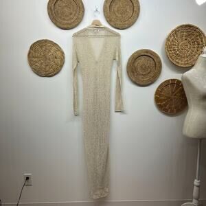 Amazing Unique Vintage BB Dakota Off White Cream Boho Bohemian Crochet Knit Long Duster Cardigan Large Festival Concert Beach Swimsuit Cover Up Western Collared Single Button Closure Flower Trim