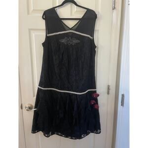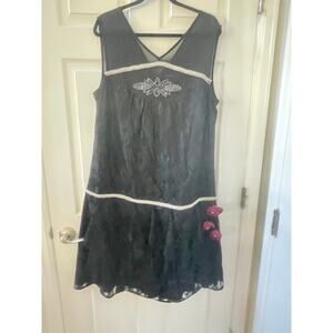 Unique Vintage Black Lace & Red Flowers Ruffle Flapper Dress 1920S Sz1X # 30