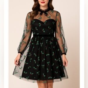 • Features: Sheer mesh long sleeves & yoke, sweetheart bodice, velvet waistband, fit-and-flare silhouette, back zipper