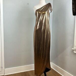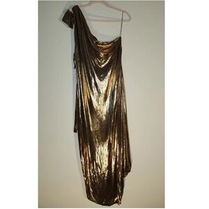 Stunning one-shoulder dress. Shimmering bronze fabric. Asymmetrical hemline. Perfect for evening wear.