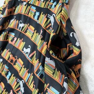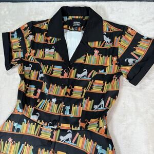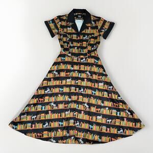 Unique Vintage Cat & Bookshelf Print Alexis Swing Dress Size Small 4 Retro 1950s