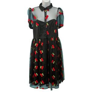 Unique Vintage Collared Sheer Embroidered Black Red Cherry Dress size L 10 12