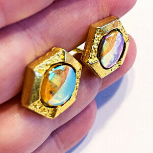 Unique Vintage Cufflinks 1970’s Goldtone & Reflecting Center Stones Hexagon Chic