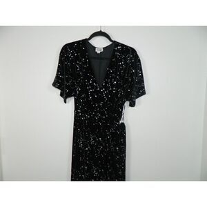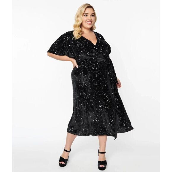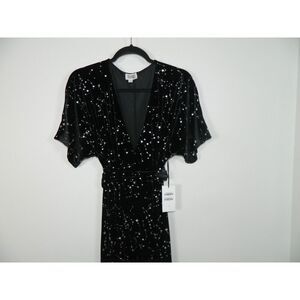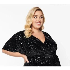 Unique Vintage Dress Size Medium 6/8 Black Silver Star Print Black Velvet Wrap Whimisgoth Grunge Dark Romance Goth