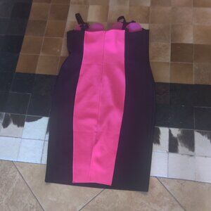 Introducing the ultimate show-stopper for your night out! Say hello to our sassy and sleek Hearts Desire bandage dress, crafted to make you feel like a fashion diva! This fitted pencil cut marvel is made of thick, stretchy material that hugs your curves like a love's warm embrace. And oh, the details! We've sprinkled some magic with Barbie pink heart-shaped bust cups, adding that playful touch you've been dreaming of. The daring black body and the bold pink color-block back will have you turning heads and dropping jaws from front to back! So, get ready to paint the town pink (and black) with this dazzling dress that's destined to make you the center of attention wherever you go!