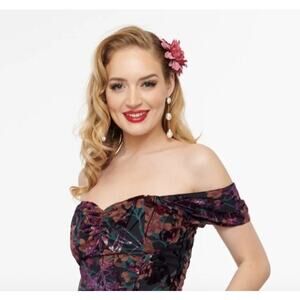 This Unique Vintage Floral Burn Out Off the Shoulder Swing Dress in size M is a stunning piece perfect for various occasions such as travel, weddings, and parties. The dress features a black floral pattern on a burnout velvet fabric, a sweetheart neckline, sleeveless design with off-the-shoulder accents, and a midi length with a trapeze and swing style. The 50s, PinUp, and Retro theme adds a touch of vintage flair to this stylish and elegant dress, making it a must-have for your wardrobe during the summer, fall, and spring seasons.