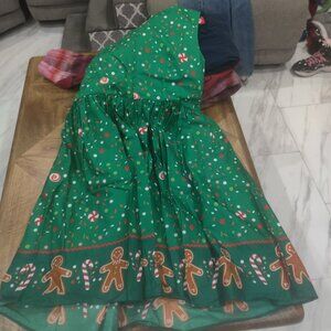 This adorable dress is crafted in green cotton and boasts an all over print of sprinkles and peppermints accented with a gingerbread man border along the swing skirt hem. The flirty swing design will have you twirling with joy, while the red self-tie sash adds just the right touch of elegance. With its convenient back zipper, getting dressed has never been easier!