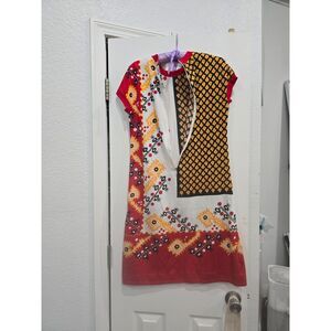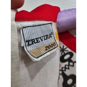 This dress, labeled Goldworm and made from Trevira 2000—a durable, vibrant polyester fabric popular in the 1960s and 1970s made in Italy—features short sleeves, a knee-length cut, and a zippered back. Its bold geometric and tribal-inspired patterns in red, white, yellow/gold, and black reflect ethnic and bohemian influences.