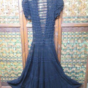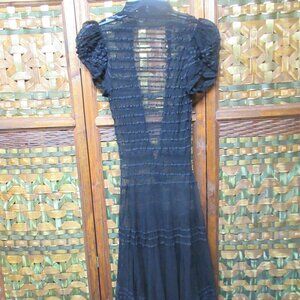 Unique Vintage Goth Elastic Bare/Sheer Midi Dress with fabric covered buttons, fitted, flattering look