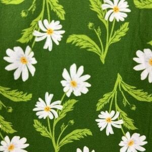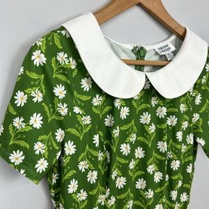 Charming green dress with white floral pattern. Features a classic white collar. Short sleeves and flared skirt.