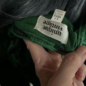 Unique Vintage Green Velvet & Black Floral Flare Dress - L/10-12