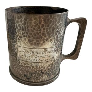 Explore a truly unique piece with this Vintage Mug by Hobart Sarcison. Crafted in silver, this #CustomizedMug features the heartwarming inscription: "James Donald Buck From Grandma 1944"—a timeless touch for collectors. Standing approximately 3.5” tall with a diameter of 2.5”, this #SilverCup is both a functional #CoffeeMug and a historical treasure. The mug is in pre-loved, good plus condition, ensuring its charm endures. Perfect for those who appreciate #vintage charm and unique collectibles.