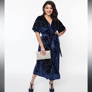 Unique Vintage Navy & Silver Stars Velvet Wrap Midi Dress Sz 1X