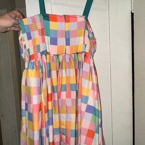 Unique Vintage Pastel Rainbow Checkered Golightly Flare Dress – NWOT, never worn (other than to try on) – Inside tag is missing, but this is a size 2X/18. This cheery and colorful dress will have you bringing sunshine wherever you go! Flaunting a gathered bodice with lined top, sweetheart neckline, and smocked sides for extra stretch and fit, there are adjustable (by button) shoulder straps which can also be crossed over to change the look. A darling fixed teal bow adorns the lined top, and the fitted bodice runs into a flowy full swing skirt (with POCKETS), creating a flattering silhouette. Made of sturdy, yet light and breezy 100% cotton, this beauty will keep you cool through the summer, and pairs great with nearly any color cardigan when the temps get cooler! Fabric does not provide stretch.