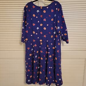 unique vintage plus size dress, 5x halloween dress, retro spooky style, navy pumpkin print, fit and flare dress, plus size novelty print, size 26w zipper back, scoop neck princess seams, 3/4 sleeve fall dress, trick or treat party, vintage inspired curvy