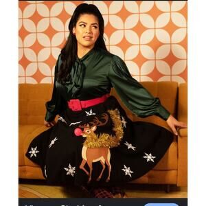 Unique Vintage Plus Size Red Nose Reindeer Soda Shop Swing Skirt giving spirit with it’s soft felt-like black fabric, cast in a fabulous 1950s swing skirt silhouette. An adorable appliqué of Santa's favorite reindeer dances on the side with sparkling tinsel leash and a blinking red nose.