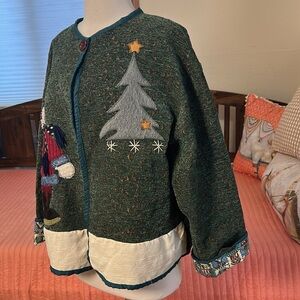 See pictures for the fun details of this unique one of a kind holiday jacket and approximate measurements