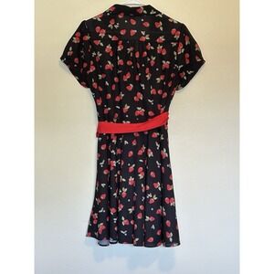 The Unique Vintage Strawberry Swing Dress in size 14 is a charming and playful wrap dress designed for women. With a black color and a strawberry pattern, this knee-length dress features short sleeves and a tie closure, adding a touch of vintage flair to any outfit. Perfect for a casual day out or a fun night on the town, this dress combines style and comfort for a one-of-a-kind look.