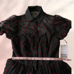 Overwhelm their thoughts, dears! This remarkable dress from Unique Vintage is crafted in a heart stopping black tulle that dances with red hearts printed throughout. The Hollie Dress features a button up front that draws all eyes to you with a darling illusion neckline, topped by a classic collar and framed by sweet short sleeves, complete with elastic cuffs. The seamed waist is cinched with a belt while the gathered swing skirt cascades over black lining for comfortable all day wear!
