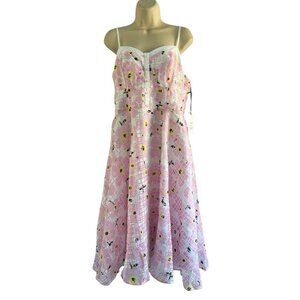 Unique Vintage Pink Floral Burnout Dress. Dress is pink and white done in a see through window pane design with white lining. It has vibrant yellow and black flowers and a fit and flare design with a square neck and spaghetti straps. Dress is made of a poly cotton blend and is a woman's size XL. Dress is brand new with tags.