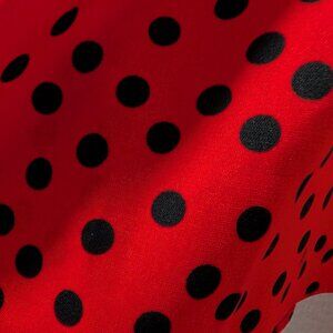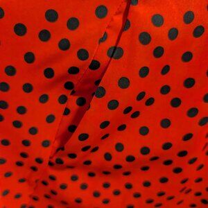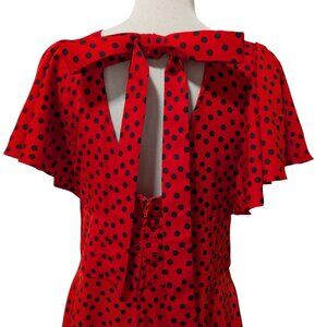 Good condition, minor signs of wear, gently used, no rips, holes or tears, pretty red w/black polka dots, v-neckline, flutter sleeves, bow tie back, retro swing dress