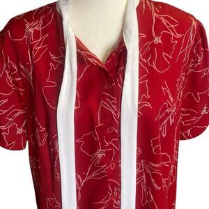 Unique Vintage Women's Top Red Floaral Button Up Tie Neck Blouse Size 16 1X
