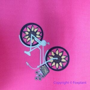 Unique Vintage X GB fit-and-flare dress, jewel neck, short sleeves, back zip closure, pink with bicycle print design.