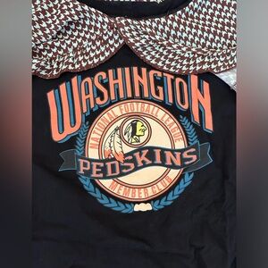I’m assuming this is a one of a kind item! Front has the Washington Redskins logo but says ‘Pedskins’. I don’t know if this was intentional or an error. There is a flowy material around the neck which covers the shoulders. The short sleeves are rolled at the end and sewn in that position. Bottom of shirt has slits in each side. It’s 21” from armpit to armpit and about 31” long. You would be the only one ready for the season with one of these!