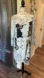 Mid length dress with long sleeves. It is light gray in color with 4 black cats playing various musical instruments. Music notes and small hearts are scattered around the dress. The back of the dress shows only the notes and hearts.