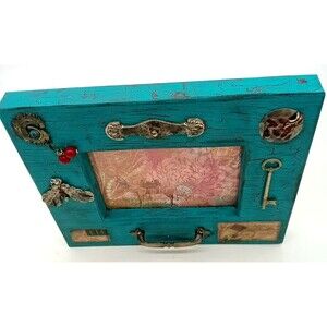 Unique Wooden Junk Art Frame Turquoise Crackle Paint Travel Theme Print Picture